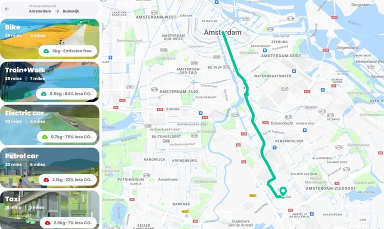 Our policy is supported with an awesome tool called Route Zero, I simply input my start and end point and it tells me the most carbon efficient journey and the duration of the options to determine if the carbon efficient path is feasible.